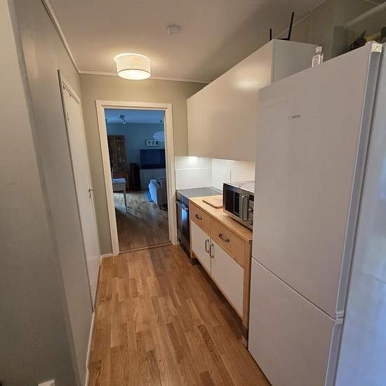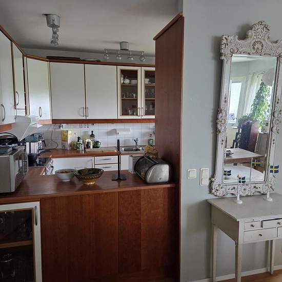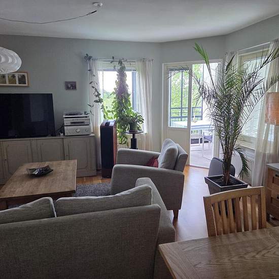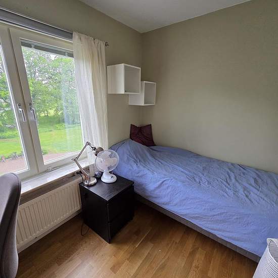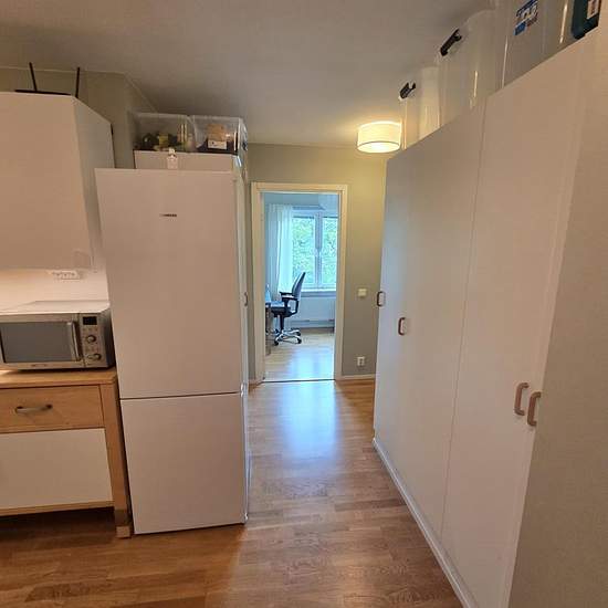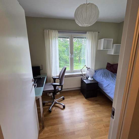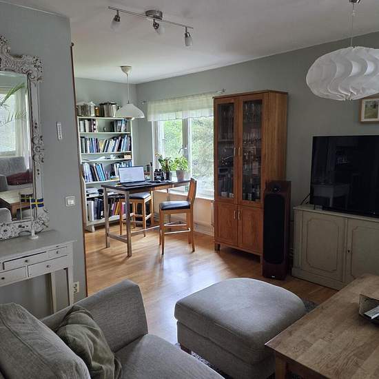 Renting out two rooms: one is about 10 sq m and the other about 15 sq m, with common areas of about 20 sq m such as a kitchenette, corridor and entryway. The smaller room costs 3,000 SEK and the slightly larger 3,500 SEK, or if you rent the entire section with two rooms, a hall and kitchenette with bathroom, 6,500 SEK. You share the kitchenette with stove, oven, microwave, fridge and freezer, and the bathroom with the other tenant. You have partial access to the whole apartment, which is 115 sq m — partly when I am traveling, which I do for ...