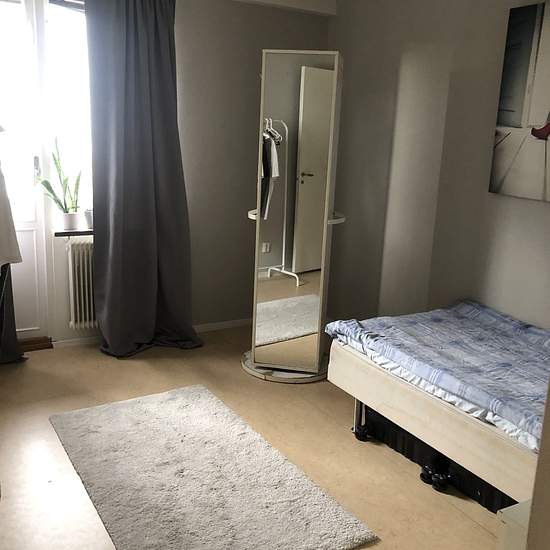 Rent och prydligt rum som är möblerat med säng och sängbord, stor spegel som går att snurra på och bakom finns hyllor och skåp. Det finns ett klädställ också samt datorbord och stol om behov finns. Serviceavgift för hyresgäst: 232