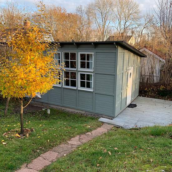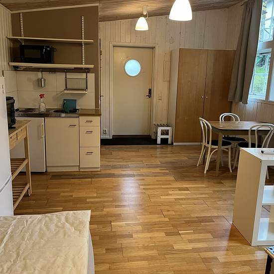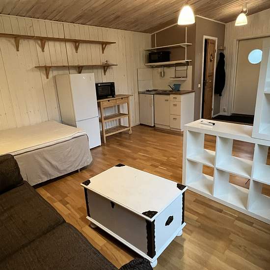 Fristående stuga om 28 kvm på vår tomt uthyres tillsvidare. Ett rum med kokvrå och litet badrum samt egen altan i söderläge. Kokvrå med två plattor, microvågsugn och fristående kyl/frys. Stugan är möblerad med säng 120 cm, soffa och soffbord, samt matbord med stolar, tv-bänk, hyllor och två garderober. Gemensam tvättmaskin och torktumlare i intilliggande bostadshus. Beläget i lugnt villaområde i Älvsjö med närhet till Älvsjöskogens naturreservat med belyst motionsspår. Mycket nära busshållplats 144 samt ca 10 minuters promenad till Älvsjö s...