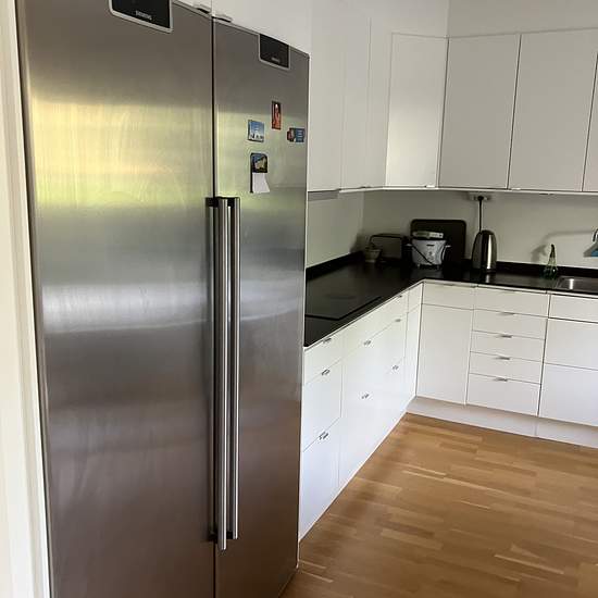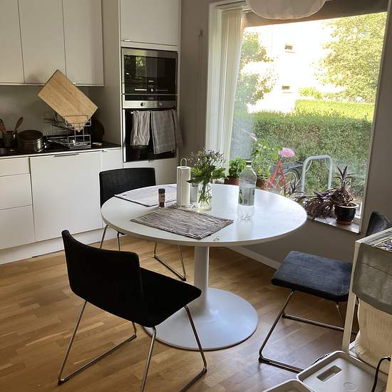 Pleasant and quiet two-storey townhouse. On the second floor there are four rooms; two are rented out, one is a shared living room/guest room. One extra room is currently vacant but awaiting a tenant. The second floor also has a bathroom with a bathtub/shower and a washing machine. On the ground floor there is a fully equipped, spacious kitchen with a fridge, freezer, dishwasher, etc. The ground floor also has a small apartment where a tenant lives. The area is calm, green and quiet, with many green spaces and apple trees. The house is smoke...