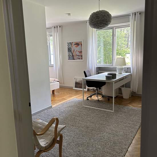 Till student eller veckopendlare. Fint rum i Djursholm, nära kommunikationer. Ta dig till KTH eller Universitetet med Roslagsbanan på 8 minuter, utan byten. Busstationen strax utanför huset tar dig Mörby Centrum och tunnelbanan (röda linjen). Ljust rum med mycket fönster. Eget badrum och en separat entré på ditt plan. Båda våra döttrar har nyligen flyttat hemifrån och nu står rummen tomma. Huset är stort och du bor ensam på nedervåningen tillsammans med vår son. Tomten är stor och generös, om du vill finns även en egen liten uteplats. Tvätt...