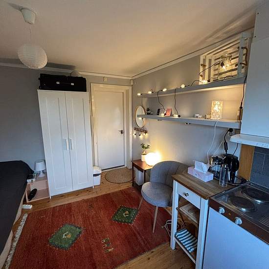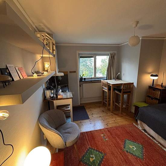 Rummet ligger ostörd på första våningen i en vackert belägen villa med utsikt över Mälaren och innerstan. Husets ägare bor på andra våningen och önskar en inneboende som kan se efter huset och vattna blommorna i trädgården. Villan ligger nära mataffärer, buss, tunnelbana och vackra promenadvägar vid Mälaren. Rummet har egen, möblerad och ostörd uteplats i soligt läge. Rummet delar nytt kök, badrum m/bastu, hall och förråd med en hyrtagare i rummet bredvid. Tvättstuga delas med hyresvärden. Rummet är 15 kvm och är möblerade med säng, arbetsbo...