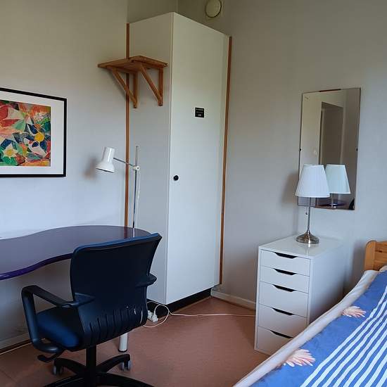 Betydligt mer privat än att hyra rum i lägenhet - och dela med hyresgäst/ägare! Du kan bo antingen på andra våningen i en villa med delat badrum, eller i källarplan med egen toa/dusch. På andra våningen delar du ett fräscht kök med med stillsam hyresgäst (med fast arbete), i separata rum. Endast en person per rum, och lås på egna rumsdörren. Villan ligger i ett lugnt område, nära till centrum/Campus. Priset inkluderar, förutom ett privat rum på ca 13 kvm, ytterligare ca 22 kvm gemensamma utrymmen. Rummet nås via trapphus (inte via familje...