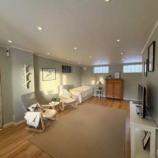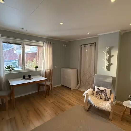 Approximately 30 m2 newly renovated apartment in part of a villa for rent until further notice. New and nice with its own bathroom and a simple kitchen. Underfloor heating and access to a private washing machine. Large open room of about 22 m2 with space for a bed, dining table, small sofa and wardrobes. Separate hall and bathroom, so the total living area is about 32 m2. Close to the center and woodland with nice walking trails. Own small outdoor patio and car parking included. There is also the possibility of access to a greenhouse. Servic...