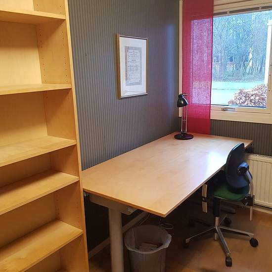 Vi har ett stort radhus där vi hyr ut ett rum på 9 kvm till en kvinnlig student. Rummet ligger precis intill ingången, medan familjen har sina sovrum på ovanvåningen. Det ingår eget badrum med dusch, och klädkammare finns i anslutning till rummet. Mer förvaring finns i källaren vid behov. Tillgång till stora gemensamma utrymmen i kök, vardagsrum (med piano), tvättstuga och uteplats. Möjlighet till parkering om du har bil. Det finns sängkläder och handdukar att låna om så önskas. Det finns också en byrå, som inte syns på bild. Radhuset är ...