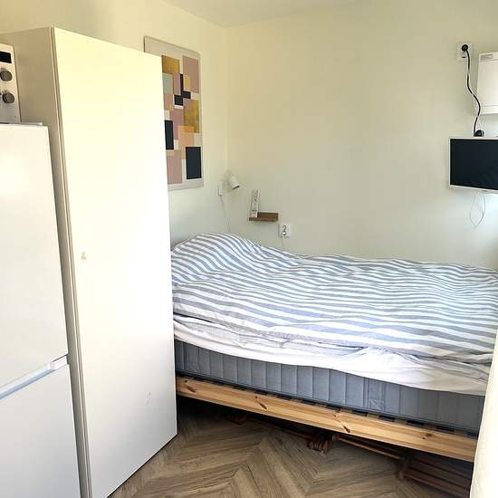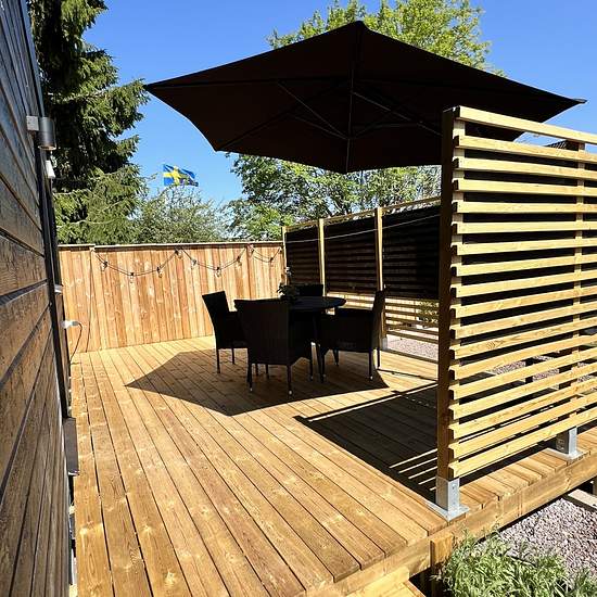 Hi! We have a cottage/Attefall house of 15 m2, newly built (completed in May 2025). An almost fully equipped kitchen with oven, hob, microwave and a larger model fridge/freezer. All kitchen equipment such as cutlery, knives, a capsule coffee machine, toaster, etc. is provided. Spacious bathroom equipped with a washing machine and underfloor heating. Sleeping area with a very comfortable 160 cm bed. Bed linen and towels are included. The cottage comes with a large and lovely outdoor patio with a table, chairs and an umbrella. In addition, t...