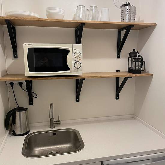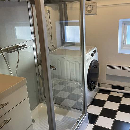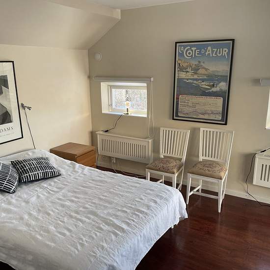 Bright, fresh room painted white with beautiful stained wooden floors and a large divided-pane studio window. Located in a house in a pleasant, quiet residential area close to transport (train and bus). Private entrance. Private small kitchen with fridge/freezer, microwave and sink, shelves for storage. Private laundry room with shower cabin, washer/dryer and plenty of storage space. The large, bright room has ample wardrobe and shelf space. It is furnished with a double bed, bedside tables, a bookcase, a desk (height-adjustable) and an offi...