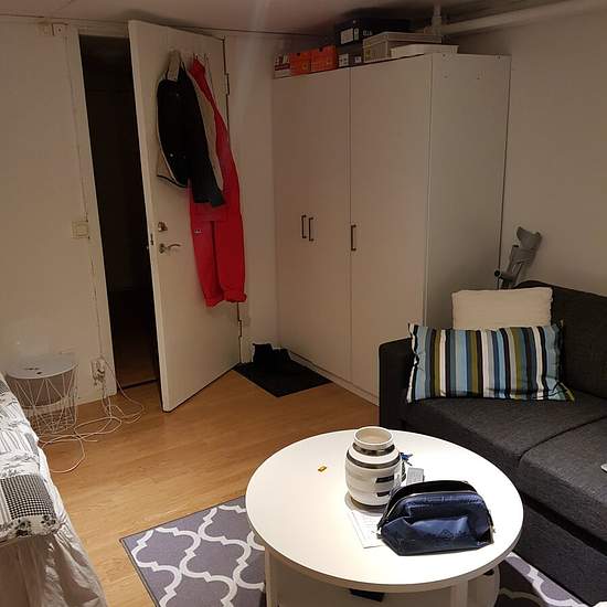 Studentrum på 15 kvm med gemensamt kök och matplats. Vi hyr bara ut till tjejer eftersom det är tre tjejer som delar på de gemensamma utrymmen såsom wc/dusch. tvättstuga med bastu. Egen uteplats. Serviceavgift för hyresgäst: 161