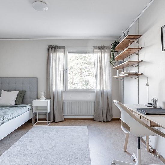 Housing Welcome to a classic student corridor housing! Student room with spacious bedroom and private bathroom with shower and toilet. Well-planned hallway with wardrobes and coat rack. In the corridor, the common space with kitchen and living room is shared with other residents. The kitchens are equipped with double stoves and ovens as well as refrigerators and freezers. All residents have their own shelf in the fridge and freezer respectively, as well as their own single kitchen wall cabinet that can be locked. Note! The pictures are samp...