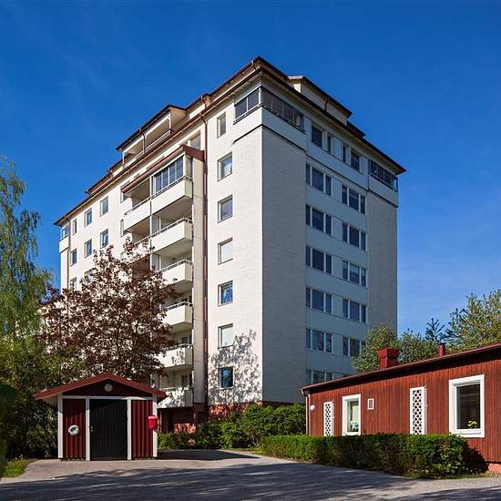 Våning 3, hiss finns Fönster i två väderstreck Utgång till balkong ifrån köket Utsikt ifrån balkongen mot Norrgårdsvägen
