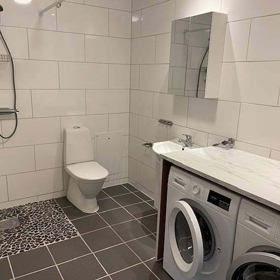 Exclusive newly built 2-room apartment in central Ängelholm consisting of: - First-class, well-equipped kitchen with convection oven, microwave oven, induction hob, cooker hood, dishwasher, refrigerator and freezer. - Living room with an open connection to the kitchen. - Bedroom with generously sized wardrobes. - Fully tiled bathroom with both washing machine and tumble dryer, as well as an electric towel warmer and electric underfloor heating.