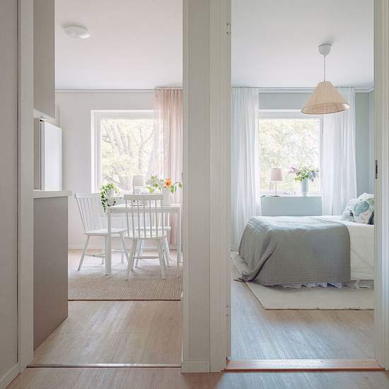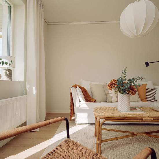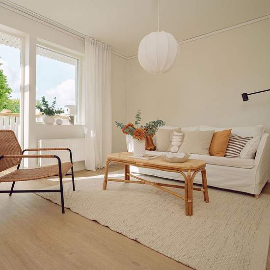 This apartment has an airy, bright Scandinavian style with consistent natural materials and a harmonious color palette in beige, white, green and light wood tones. Living room: A welcoming room with large south-facing windows that let in plenty of natural light. Wall color code NCS: 1002-Y20R. Balcony: A lovely, spacious south-facing balcony with a wooden deck and white railings that get a lot of sun during the day. The balcony is perfect for morning coffee or evening relaxation, with room for a seating area and plant corners. The beautifu...