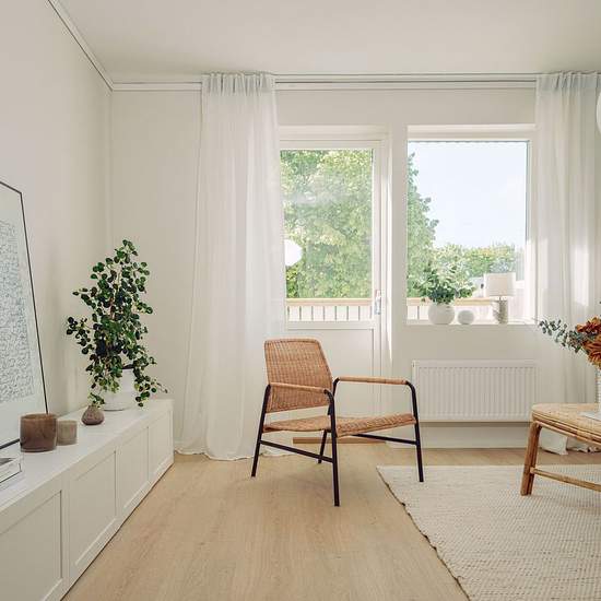 Den här lägenheten har en luftig och ljus skandinavisk stil med genomgående naturliga material och en harmonisk färgpalett i beige, vitt, grönt och ljusa trätoner. Säkerhetsdörr är installerad och en stor balkong vetter ut mot grönängsområde i söderläge. Deposition tillkommer på denna lägenhet med 6000kr. Vardagsrum: Ett välkomnande rum med stora fönster i söderläge som släpper in mycket naturligt ljus. Färgkod vägg NCS: 1002-y20r. Balkong: En underbar och rymlig balkong i söderläge med trädäck och vita räcken som ger mycket sol under d...