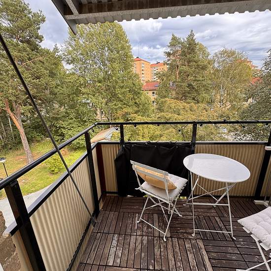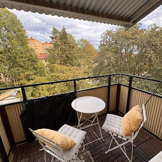 Charming 1940s apartment with two rooms and a kitchen, equipped with a gas stove and dining table. The apartment has a balcony with a beautiful view of a lush park. The location is very convenient – just a couple of minutes' walk to the bus stop and ICA. Gullmarsplan can be reached in about 10 minutes on foot or 2 minutes by bus, and it takes only 8–10 minutes to get to Södermalm. The area is quiet and child-friendly, with several playgrounds and green spaces nearby. Service fee for tenant: 595.