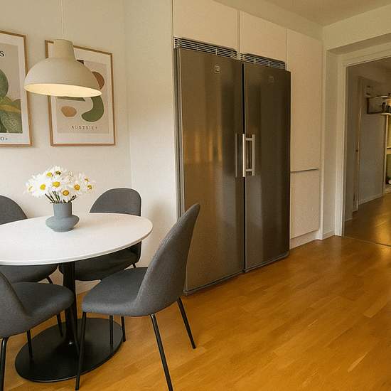 The kitchen is modern and well-equipped, with a built-in microwave and dishwasher that make cooking and everyday life easy and convenient. The high-quality materials and smart design make the kitchen a pleasure to use. The apartment has elegant parquet floors that run through all rooms and create a cohesive and luxurious atmosphere. The large fully tiled bathroom is both sleek and practical, with modern details that enhance your daily comfort. One of the apartment’s highlights is the lovely balcony accessed from the bedroom. Here you can enj...