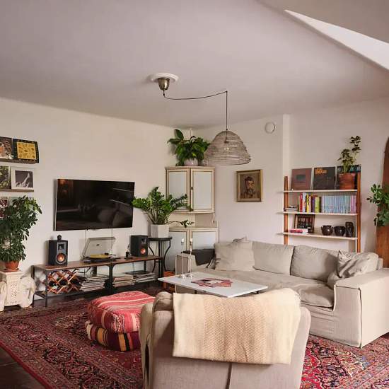 Charming Renovated Attic Apartment in Old Enskede A bright and cosy attic apartment with exposed wooden beams and a warm, inviting feel. The open-plan layout combines classic character with modern comfort, offering generous social spaces, a separate sleeping area, and good storage throughout. The kitchen is practical and well equipped, with a 5-burner gas cooktop and two electric ovens. Large fridge-freezer and dishwasher. The bathroom has underfloor heating and a double shower. The living room is spacious and airy with plenty of natural l...