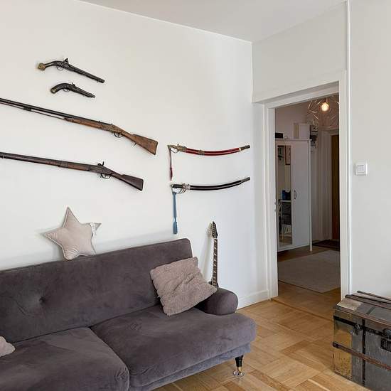 Very pleasant 1930s apartment with a good central location. The entire apartment has light-painted walls. Large welcoming hall with light walls and original parquet flooring; there is also a walk-in closet in the hall. Functional kitchen with provision for a dishwasher. Here lies a newer carpet. Smaller bedroom but with a small walk-in closet. The living room is large and spacious, also with parquet flooring. Bathroom with bathtub. The apartment has a security door.