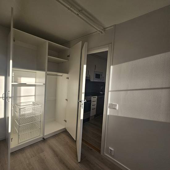 Welcome to a renovated 2-room apartment with consistently high and modern standards. ENTRANCE HALL Welcoming entrance hall with black entry flooring, white walls and wood laminate flooring - there is also a walk-in closet. KITCHEN Modern kitchen with stainless steel appliances, anthracite gray countertops and a ceramic glass hob. The cabinet doors are white with sleek steel handles. The kitchen is equipped with a fridge/freezer, oven and hob, extractor fan, dishwasher and integrated microwave. BATHROOM The apartment has one bright fully t...