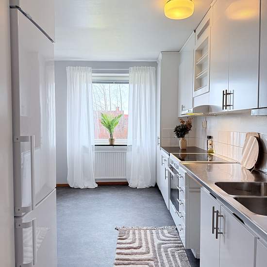 BO BRA – Rymlig 2:a med nya köksluckor Genom vår 3D-visning kan du smidigt få en virtuell visning av lägenheten hemifrån. Denna lägenhet har nyligen renoverats med stilrena vita köksluckor som skapar en fräsch och ljus atmosfär. Från köket leder en dörr ut till den soliga balkongen i söder, perfekt för avkopplande stunder utomhus. Badrummet är praktiskt inrett med en dusch och en egen tvättmaskin, vilket ger extra bekvämlighet i vardagen. I vardagsrummet möts du av ljusa väggar, parkettgolv och stora fönster i söder som släpper in riklig...