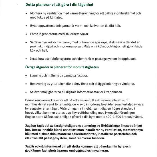 Bostad VIKTIG INFORMATON: Gällande renovering som ska ske samt hyreshöjning i vår fastighet, finns att läsa i annonsen. Våra nya hyresgäster kommer att få godkänna detta i en bilaga till hyresavtalet som undertecknas. Angivna hyran är den som gäller nu, före stora renoveringen med att byta kök mm. Obs! Ingen fysisk visning. Välplanerad 2:a med inglasad balkong i vårt charmiga 50-tals hus! Före tillträdet: Samtliga väggar/tak/snickerier/garderobsdörrar kommer att målas. Vitt. Ekparkett ska läggas i vardagsrum. Köksluckor målas vita. ...
