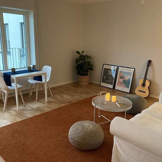 Väl disponerade ytor, stort ljusinsläpp och med omsorg vald inredningen av hög kvalitet med lång livslängd, bra funktion och omtanke om miljön. Ljusa och neutrala färgtoner har valts så att de lätt passar ihop med andra färger. Det finns avställningsytor och förvaringsutrymmen för allt som man behöver - porslin, bestick, hushållsmaskiner och mycket mer. Köksluckorna är släta, stänkskyddet är av kakel och bänkskivan av laminat. Ytorna är tåliga och lättstädade. Av samma anledning är golven av ekparkett och badrummen helkaklade. Köket är förb...