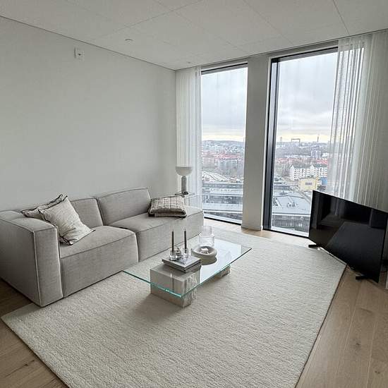 Welcome to this stylish and well-planned one-bedroom apartment on the 16th floor of Karlatornet. With sweeping views of Gothenburg’s harbor entrance, this home offers a bright, open living space and floor-to-ceiling windows that fill the interior with natural light. The open-plan kitchen and living room create a spacious social area, while the bedroom features direct access to a generous walk-in closet and a private balcony with beautiful water views. A modern bathroom with integrated laundry adds everyday convenience. Highlights: • 16th-...