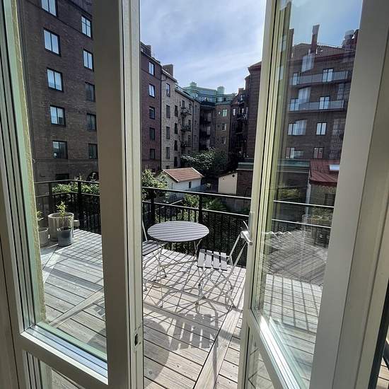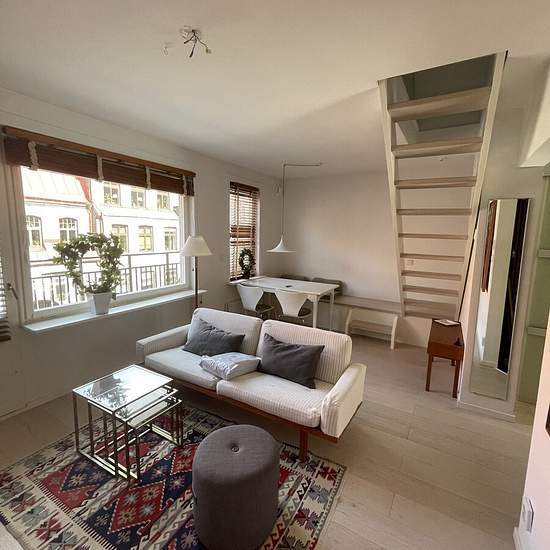 We will now rent out our beloved, fully furnished apartment for 2.5 months while we travel abroad. This apartment is perfect for a couple or a single person looking for a special place in the heart of Gothenburg with a large private terrace. The apartment is on the top floor of a shared apartment complex right on the western edge of Kungsgatan and spans two floors (maisonette apartment) with 45 square meters of net living area. The lower floor has a modern kitchen, a bathroom with shower and an open living and dining area. There is also acc...