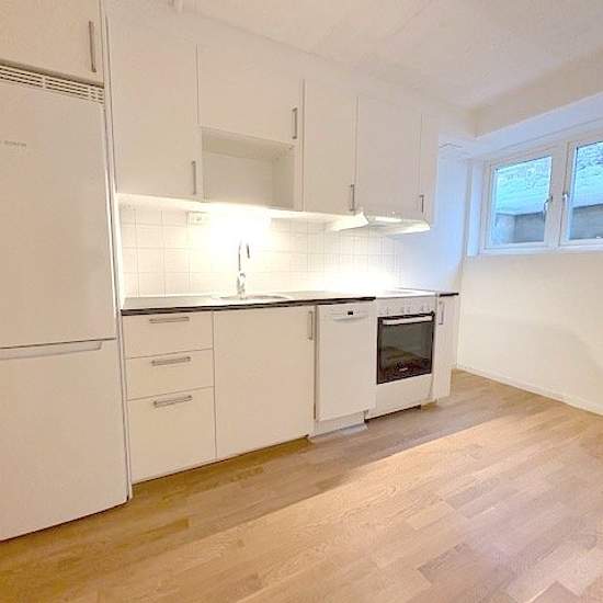 Modern and fully renovated apartment on Fastlagsvägen On Fastlagsvägen in the attractive Midsommarkransen a stylish, fully renovated 2-room apartment of approximately 40 sqm is now being offered. The apartment is on the lower level and has an overall fresh feel with brand-new floors, a newly installed kitchen and a newly renovated bathroom. Smart spaces with a well-planned layout The residence consists of a bright open room/living room and a well-equipped kitchen with space for a small dining table for two. The sleeping area is practicall...