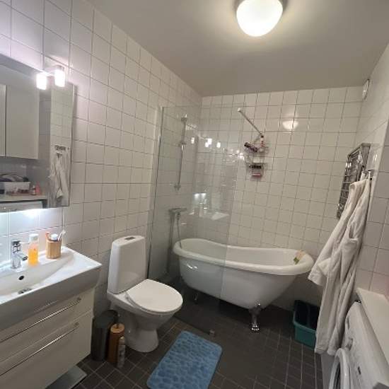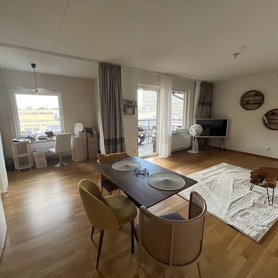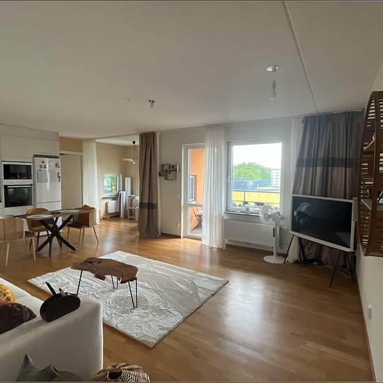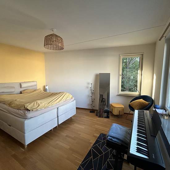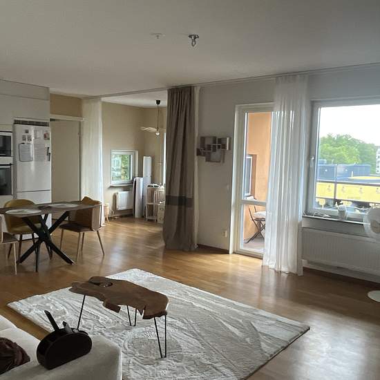 Large and luminous apartment in Telefonplan. 63 sqm surface + a balcony. Super spacious, luminous living room. Big windows leading to a clear view. A remote work area (with an option to isolate with opaque curtains), TV and piano available, a fully equipped kitchen, a large bedroom with queen size bed and a lot of storage, and a big bathroom with bathtub and washing machine + dryer. Great location: close to supermarkets (Hemköp, ICA, Coop), bakery, gym (SATS, 1 min away), climbing center (the biggest in Stockholm, great for both rope climb...