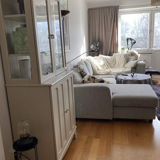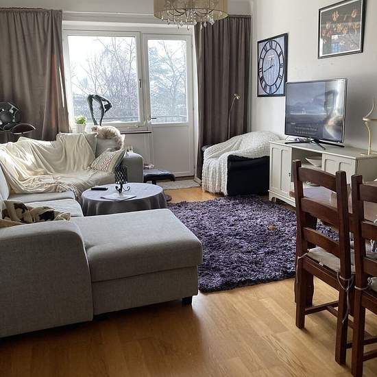 Nice bright large 2-room apartment near Midsommarkransen subway, a 3-minute walk. 180 cm bed in the bedroom. Everything is included in the rent: internet, TV, electricity, gas, insurance. Note: For rent only until July 31. May possibly be rented earlier than May 1. Service fee for tenant: 803.