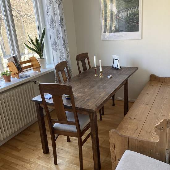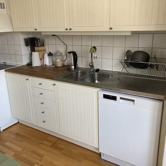 Charming renovated apartment in a 1930s building Munkavägen 12, Olympia Large kitchen with dishwasher and separate dining area Large living room separated by an arch to an adjoining space, access to a balcony. Large bedroom with wardrobes. Two walk-in closets. Fully tiled bathroom with shower. Good, easily accessible laundry room is available in the building. Bicycle room and storage in the basement. Parking space available to rent if desired. Quiet location, near the city center and the hospital, approximately a 10-minute walk to Stortorget...