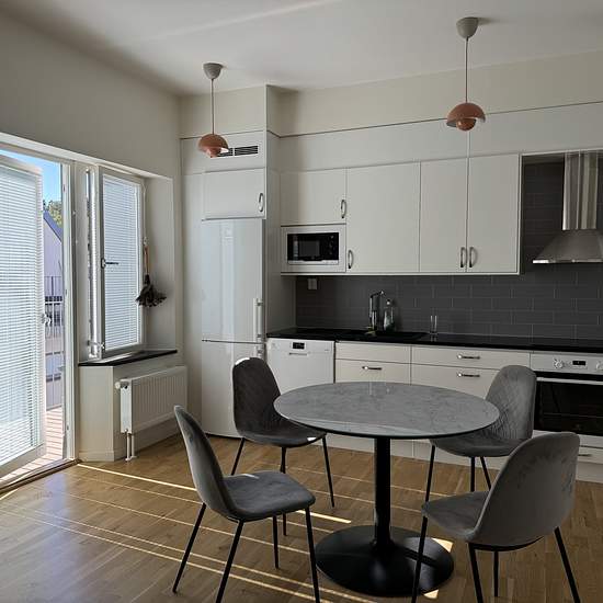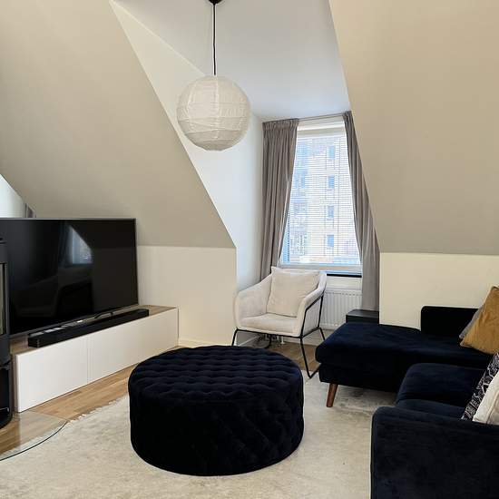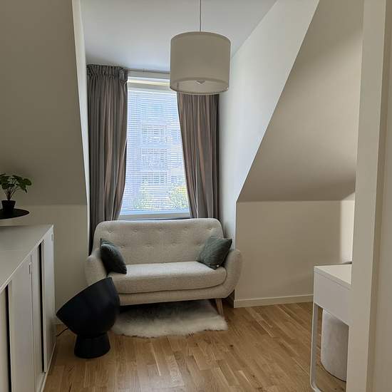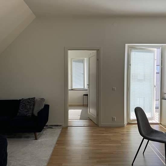 Bright and open 58 sqm apartment on the top floor with a balcony and very generous ceiling height for rent. Immediate move-in possible. The apartment: Newly built apartment Furnished Balcony Dishwasher Washing machine and tumble dryer Fireplace TV with surround sound system The rent includes electricity, water and internet The area: Direct bus connection to the city center with frequent service Several grocery stores, gyms, a pharmacy, a health center and a dentist on the square next door Within walking distance to natural areas Service...