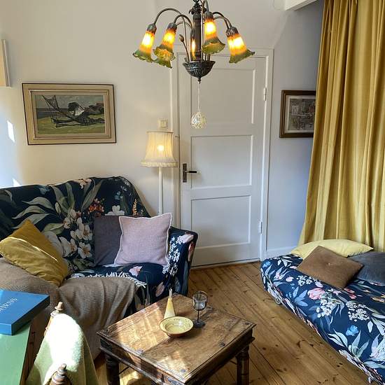 För att komma till lägenheten går man in genom en grön träport i det gula stenhuset, ut på innergården och in genom en vit dörr på andra sidan gården, som vaktas av statyn Atlas. En trappa upp ligger lägenheten rakt fram. Väl uppe välkomnas vi av en hall och entré som integreras med det nätta köket. I hallen finns det plats för ytterkläder och skor, här är golvet vitmålat. Köket är nätt, men har allt man behöver, såsom spis, ugn, fläkt, kyl och frys. Här finns ett skafferi med god plats för förvaring. Köket har vita luckor samt rostfri disk...