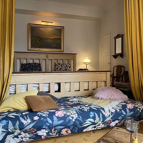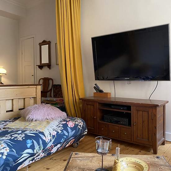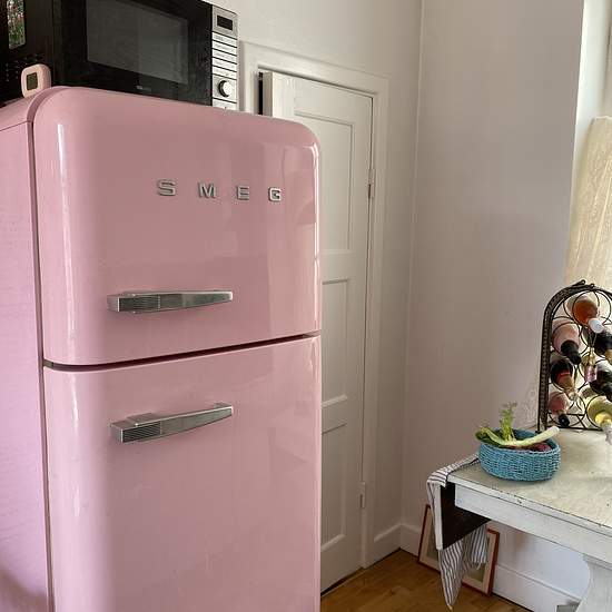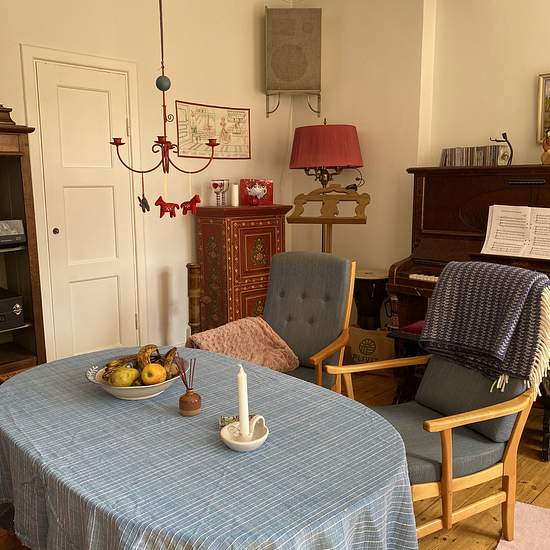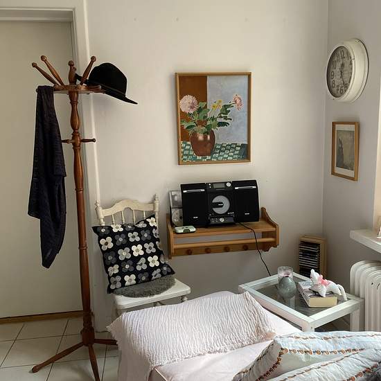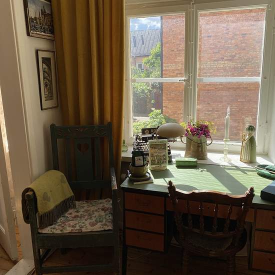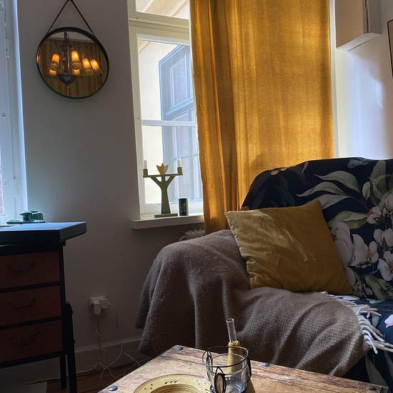 To reach the apartment you go in through a green wooden gate in the yellow stone building, out into the inner courtyard and through a white door on the other side of the courtyard, which is guarded by the statue Atlas. One flight up the apartment is straight ahead. Upstairs we are welcomed by a hall and entrance that are integrated with the compact kitchen. In the hall there is room for outerwear and shoes; the floor here is painted white. The kitchen is compact but has everything you need, such as a stove, oven, extractor fan, fridge and f...