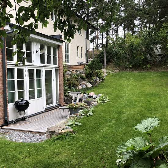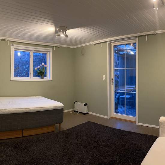Two pleasant rooms with direct access to a private garden. The garden room has a sleeping loft with full standing height. Shared entrance and laundry area with an apartment one floor up. Close to nature and swimming. Direct bus to the university and Ropsten. Service fee for tenant: 768