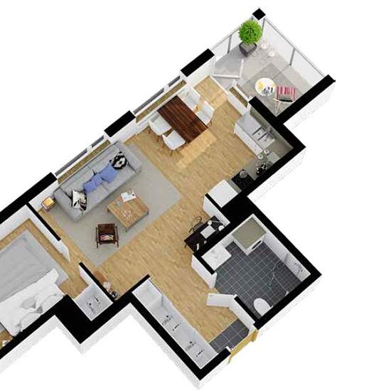 Apt. 0501. A bright and nice one-bedroom apartment with an open-plan layout. Light walls and white cabinet doors in the kitchen. Fully tiled bathroom with a shower corner and a washer-dryer combo. Large wardrobe with sliding doors in the hallway and a balcony where you can enjoy the morning sun.