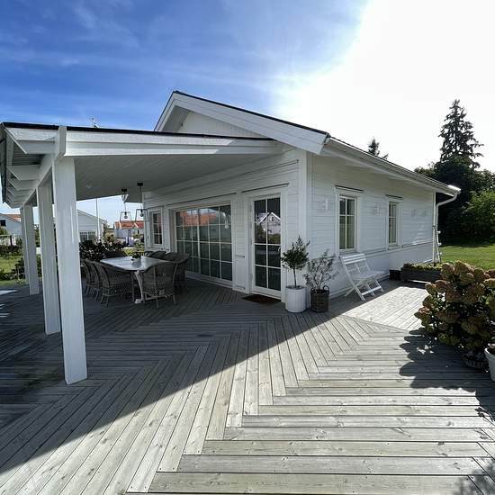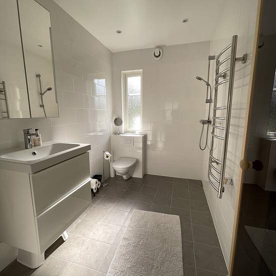 Bright and fresh guest house of 55 m² for rent. Built in 2021 to modern standards. Bedroom, living room and equipped small kitchen (refrigerator and combined oven/microwave). Bathroom with washing machine and combined dryer. AC for cooling and heating. Available partly furnished or unfurnished on request. Suitable for someone who wants to live comfortably and modernly in a quiet location. Parking is available on the premises. Electricity and internet are included in the rent. Service fee for tenant: 470