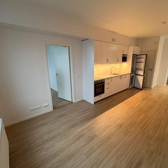 The apartment is tastefully decorated with oak laminate flooring, light-painted walls, and has all the standard features needed for comfortable living. This is a smartly planned home with a living room that has space for both a dining table and a sofa, and a separate bedroom. The kitchens are equipped with a hob, oven, and combined fridge/freezer. The bathrooms have white tiles and gray floor tiles. The apartment has its own washer/dryer as well as a storage system in the hallway where you can purchase your choice of shelves and other fitt...