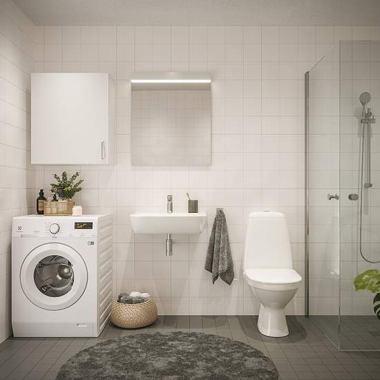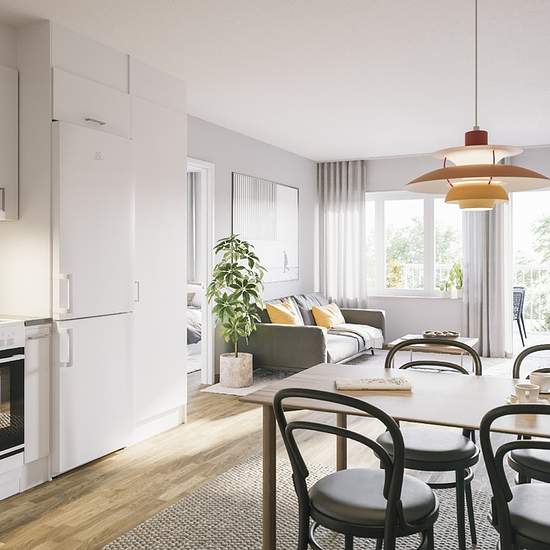 Lägenheten har en ljus och öppen planlösning med ljusgrå väggar, vita tak och genomgående parkettgolv. Köket har vit skåpinredning med full takhöjd, kakel som stänkskydd och bänkskiva i laminat. Till det är köken utrustade med spis, ugn, kyl/frys och diskmaskin. I de helkaklade badrummen finns en kombinerad tvättmaskin och torktumlare installerad som hjälper till med vardagens sysslor. Alla lägenheter har säkerhetsdörr. Tillhörande förråd finns i lägenheten. Utanför fastigheten finns parkeringsplatser, vissa med laddningsmöjlighet för elbi...