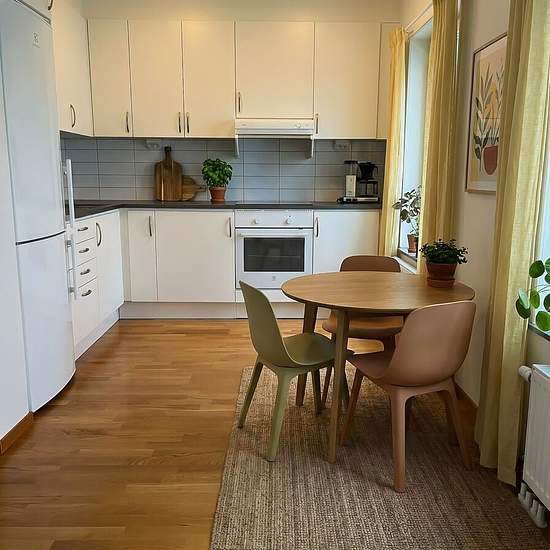 Välkommen till ett hem som kombinerar stil, komfort och funktionalitet Redan i den generösa hallen möts du av en välkomnande atmosfär med praktisk hatthylla och utmärkta förvaringsmöjligheter i form av garderober och städskåp, perfekt för att hålla ordning och reda. Vidare in i bostaden öppnar sig en ljus och luftig planlösning där vardagsrum och kök smälter samman i en modern helhet. Köket är smakfullt inrett med vita köksluckor, grå bänkskiva och god förvaring. Här finns allt du behöver: kyl/frys, induktionshäll, ugn samt förberett för dis...