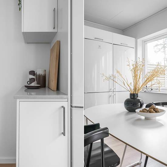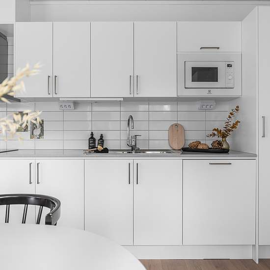 Unique two-room apartment in our popular low-rise building! HALL Light gray tiled floor and white-painted walls. There is a built-in wardrobe and space for hanging coats. BATHROOM Light gray tiled floor and white fully tiled walls. There is a toilet, heated towel rail, shower with glass wall, sink with vanity unit, and a bathroom cabinet with mirror and lighting. The bathroom is also equipped with a washing machine and tumble dryer with an accompanying worktop in gray laminate. KITCHEN Oak laminate flooring and white-painted walls. White ...