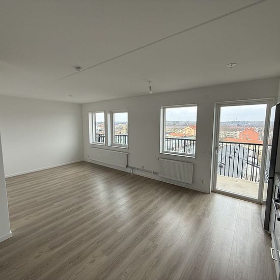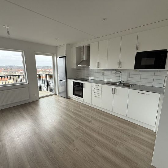 Rymlig och modern tvårumslägenhet med balkong på våning 6 Välkommen till denna mycket fräscha och välplanerade bostad från 2022 med modern standard, fina materialval. Lägenheten erbjuder ett bekvämt boende på våning 6 med öppen planlösning och balkong. Hallen har ljusgrått klinkergolv, vitmålade väggar, platsbyggd garderob och plats för avhängning. Köket är modernt och stilrent med vit köksinredning från Ballingslöv, grå bänkskiva i sten samt utrustning som diskmaskin, inbyggd mikrovågsugn, ugn och spishäll. Den öppna planlösningen mellan...