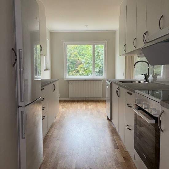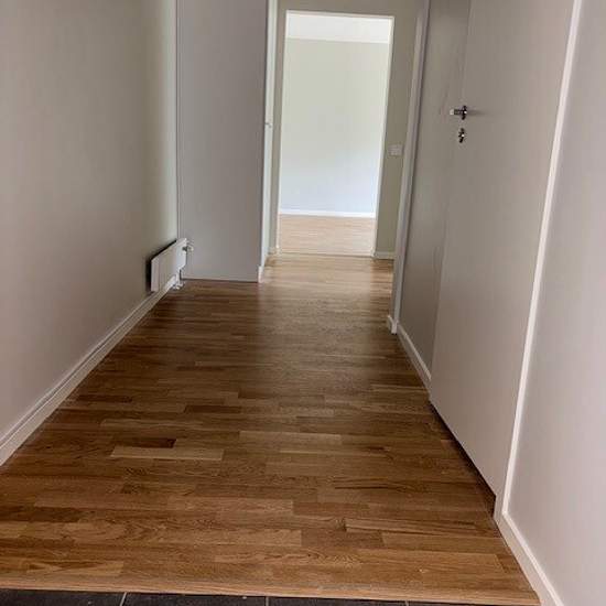 Renovated, harmonious home in a nature-close area within walking/cycling distance to the town center, 2 rooms and a kitchen plus a balcony! Spacious hallway with storage and good space to hang outerwear. The apartment has oak parquet flooring and light walls throughout, with tiles just inside the front door. Bathroom off the hallway, modernly renovated when the rest of the apartment was fully renovated in 2020. Fully tiled with pleasant underfloor heating, towel warmer, vanity unit, bathroom cabinet with full-length mirrors, toilet and show...