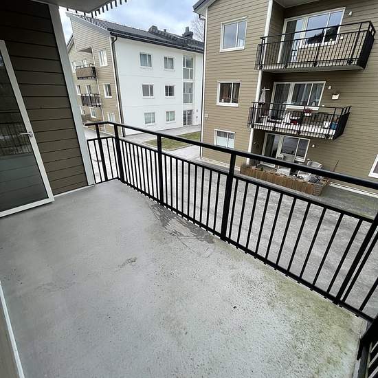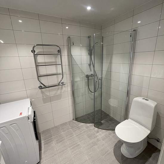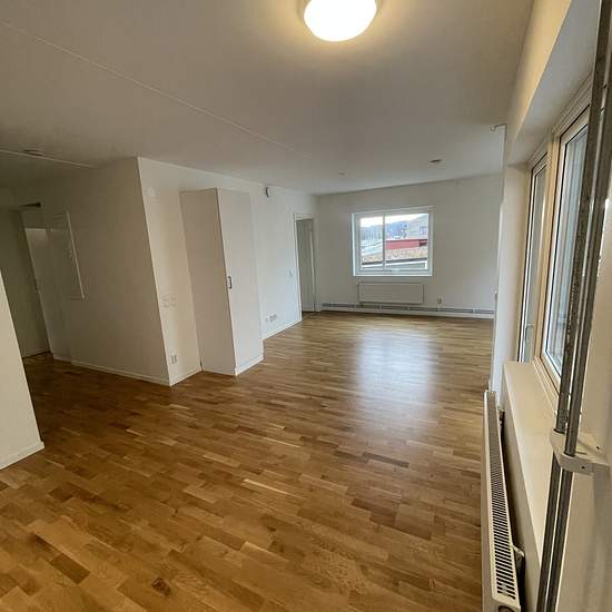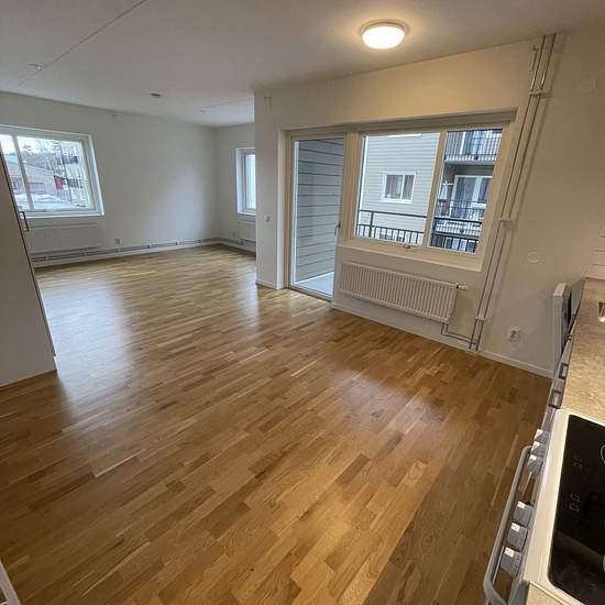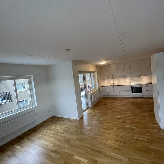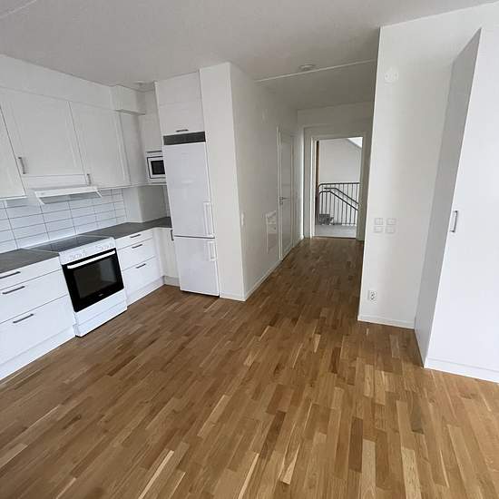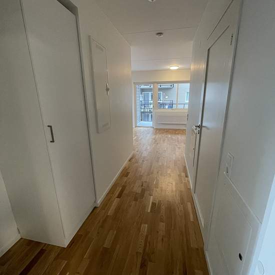 Modern apartment with balcony. Well-planned and bright apartment with white-painted walls and parquet flooring. Kitchen with white cabinet doors, white tiles and dishwasher. Bathroom with gray tiled floor with underfloor heating, white wall tiles and spotlights in the ceiling. Shower with doors, towel radiator and combined washer/dryer. Vanity unit under the sink and mirror cabinet with built-in lighting. The apartment includes a storage room located in the basement of building no. 9. There is also a bike shelter and a storage room with an e...