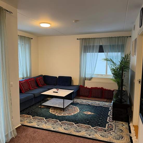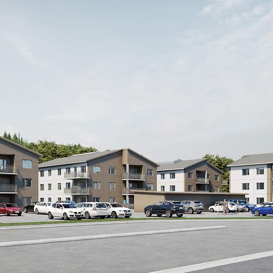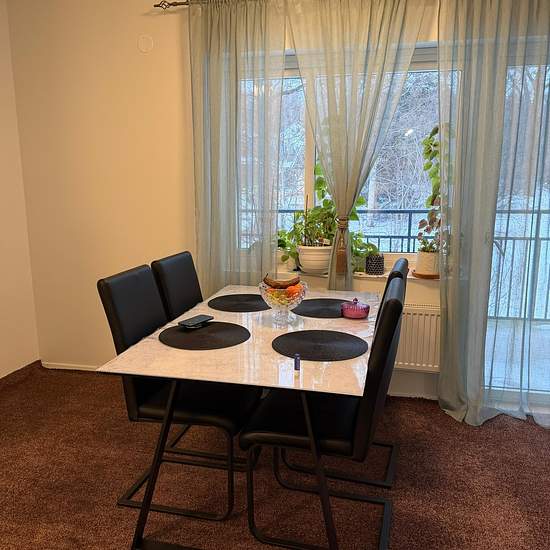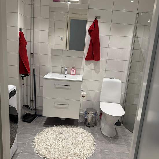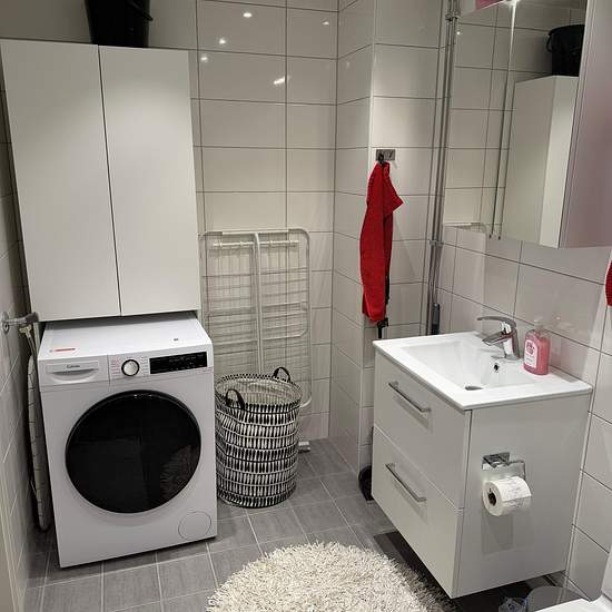 Modern apartment with balcony. Well-planned and bright apartment with white-painted walls and parquet floors. Kitchen with white cabinet doors, white tiles and dishwasher. Bathroom with gray tiled floor with underfloor heating, white tiles on the walls and spotlights in the ceiling. Shower with doors, towel warmer and combined washing machine/dryer. Vanity unit under the sink and a mirrored cabinet with built-in lighting. The apartment includes a storage room located in the basement of building no. 9. There is also a bike shelter and a stora...