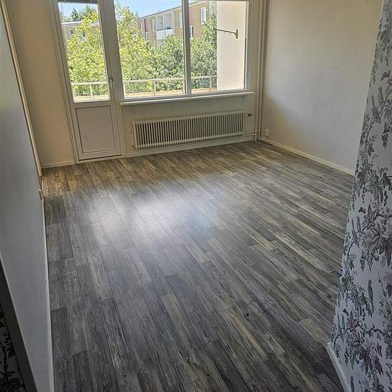 Bright and nice apartment with a balcony. Large kitchen with plenty of storage, space for a dining table. Small room between the living room and kitchen, suitable as a bedroom. Wardrobes in the hallway and also space for a chest of drawers. Large windows in the living room provide a nice amount of light, access to the balcony. Tiles on the bathroom wall, mat on the floor. The photos of the apartment are not from this specific unit; they show the same layout.