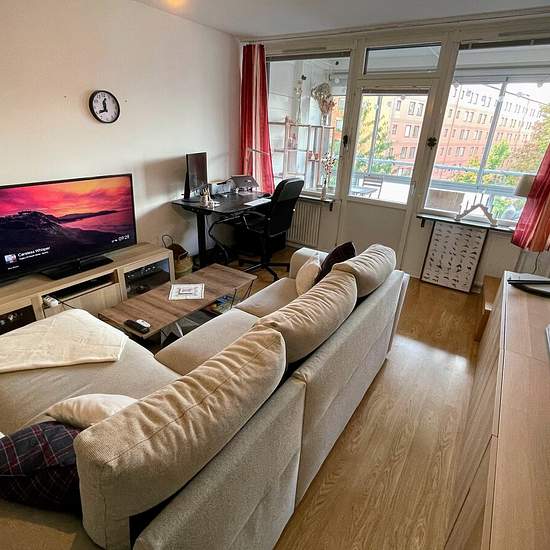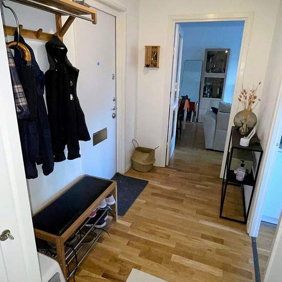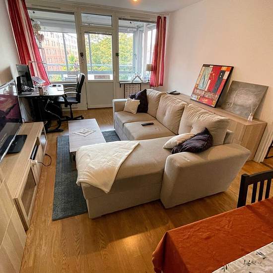 Spacious one-bedroom apartment with an enclosed balcony for rent. Large living room and separate kitchen. The bedroom can accommodate a 180 cm wide bed. Available for rent for only one month due to an extended trip. Fully furnished. The rent includes everything except electricity. Access to a laundry room, sauna and gym. Located 3 minutes from Bergshamra subway station (about 12 minutes from T‑Centralen), also close to water and natural areas. Service fee for tenant: 721