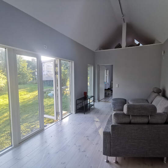 Modern newly built mini villa with a large bedroom featuring a spacious wardrobe and 2 large sleeping lofts with skylights. You will be the first tenant. Fully tiled bathroom with underfloor heating, modern kitchen with new appliances, painted walls, wooden floors, hallway with tiled floor and underfloor heating, ceiling height in the living room is approximately 4 meters to the peak. Bright mini villa of 60 sqm + loft with large windows in all rooms. Access to your own terrace, access to the garden with fruit trees, and a parking space. 15 ...