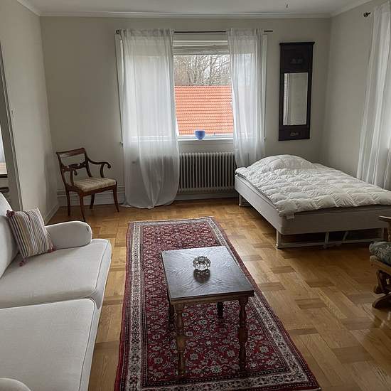 Nice, slightly old-fashioned 2.5-room apartment with parquet floors and a fireplace. Fresh bathroom, slightly old-fashioned but functional kitchen. Very large, lovely balcony with a wonderful view of the Cathedral and the Domkyrkoberget gardens. Small lake view towards Lake Mälaren. Located in pleasant historic quarters. Access to a garden. A wonderfully charming apartment rented out for periods not exceeding one year, partly furnished but with space for a few personal items. Electricity is included in the rent. Service fee for tenant: 386