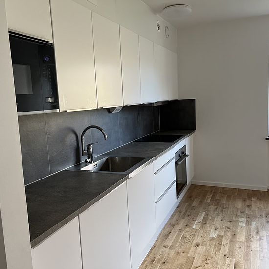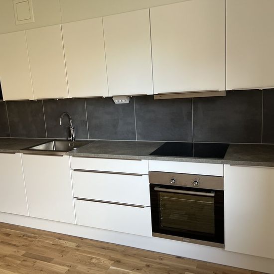 Welcome to a 2-room apartment with a kitchen on the second floor. About the apartment Throughout the apartment, there are parquet floors and smooth, white walls. The kitchen is furnished with white cabinets, a gray countertop, and stainless steel appliances (induction cooktop, convection oven, built-in microwave, and fridge/freezer). The bathroom is decorated in a stylish gray and white with a towel dryer and underfloor heating. Washing machine and dryer in the bathroom. About the area Central location. Close to grocery stores, publi...